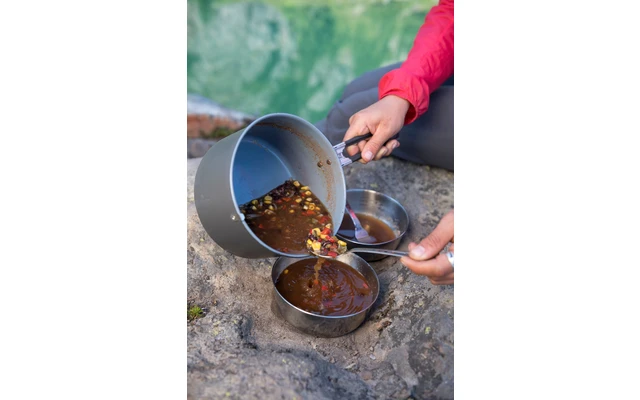Esta robusta horquilla de acero inoxidable tiene una boquilla integrada y una herramienta con cable para realizar el mantenimiento de las cocinas de combustible líquido MSR sobre la marcha.