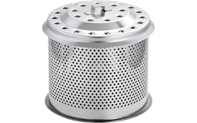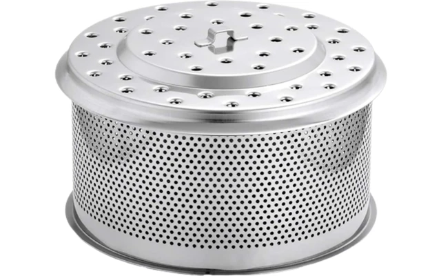 El robusto contenedor de carbón hecho de acero inoxidable perforado es adecuado como contenedor adicional cuando la barbacoa dura más tiempo y hay que «rellenar» el carbón rápidamente. El recipiente, con su tapa perforada, retiene el carbón de forma completa y fiable, evita que salgan chispas y, al mismo tiempo, permite que el calor salga hacia arriba sin obstáculos.