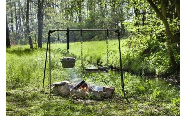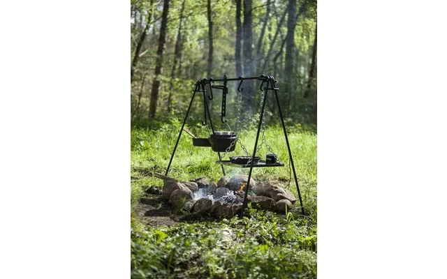 Gracias a la construcción de ojetes, el puente de fuego se sostiene de forma segura sobre cuatro patas y está listo para su uso en poco tiempo. Gracias al travesaño de 115 cm de longitud, puede montar su cocina de camping sobre una o varias chimeneas. Puede colgar sus utensilios de cocina a diferentes alturas sobre el fuego en los tres ganchos de diferentes longitudes. De este modo, puede regular la temperatura de cocción de sus alimentos y bebidas en tres etapas. La rejilla de la parrilla tiene una suspensión de cadena que puede ajustarse flexiblemente en longitud. El borde redondo mantiene sus alimentos, sartenes y similares en su sitio. Con esta cocina profesional para exteriores, incluso las comidas de varios platos en la hoguera ya no son un reto para todos sus amigos de acampada.