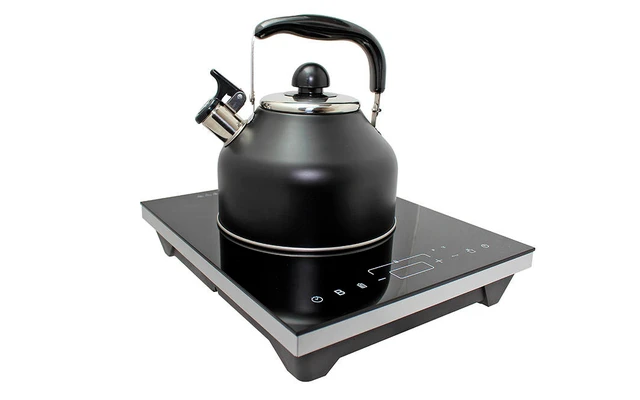 El hervidor está fabricado en acero inoxidable de alta calidad y el cuerpo tiene un acabado negro satinado. El asa de plástico, alta y fresca, está articulada en la base, lo que la hace perfecta para guardarla cuando se viaja y facilita el llenado de agua antes de usarla. La elegante tapa de acero inoxidable tiene un botón de plástico de tacto frío que permite hervir el agua de una en una para mantener a las tropas