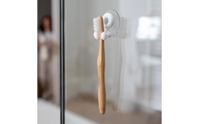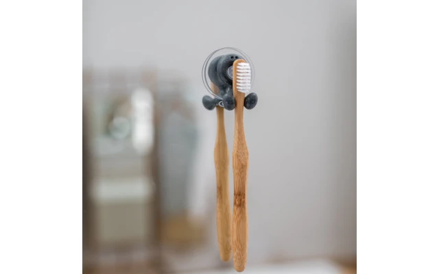 Los cepillos de dientes pueden quedar sueltos aquí. TOMMY extiende ambas patas y ofrece una sujeción fresca y aireada para los cepillos de dientes. Una solución rápida y que ahorra espacio, especialmente para baños pequeños. El soporte para cepillos de dientes se fija simplemente a la pared con una ventosa, sin esfuerzo de instalación ni perforación de azulejos.