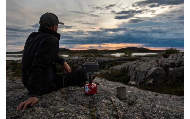 Este hervidor de aluminio especialmente ligero impresiona por su tecnología de vertido de precisión y produce un vapor denso y dirigido, perfecto para crear la taza de café perfecta. También es adecuado para recipientes de bebida con una abertura pequeña. La vajilla se mantiene limpia gracias a la salida antigoteo. La tapa no se desliza al verter y puede retirarse fácilmente. Además, el asa se mantiene en posición vertical, alejada de la tetera caliente y no está demasiado caliente al tacto. La amplia abertura de la tetera facilita la limpieza y permite guardar en su interior un pequeño hornillo y otras cosas. Especialmente indicada para los aventureros que cuentan gramos, la tetera es ideal para hervir comida embolsada.