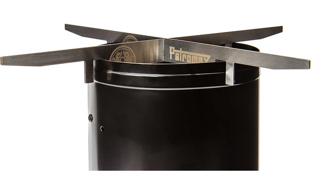 El soporte de fuego se adapta a los arrancadores de barbacoa o a las estufas de leña con un diámetro de 14,5 cm a 16,5 cm y de 19 cm a 25 cm. Después de enchufarlo, se conecta el soporte del fuego a la chimenea de iluminación a través de los recortes prefabricados. De esta forma, se crea rápida y fácilmente una fuente de calor para precocinar y chamuscar o una práctica superficie de almacenamiento.