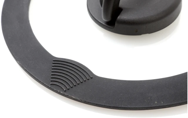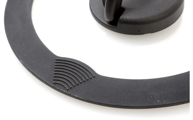 Tapa de vidrio con borde protector de silicona con abertura para el tamiz y ranura para fijar las pinzas del mango.