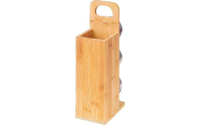 Atractivo organizador de bambú que incluye 3 especieros magnéticos de acero inoxidable y una práctica asa de transporte, para la gastronomía o el hogar, para guardar/transportar cubiertos, especias, servilletas y demás.